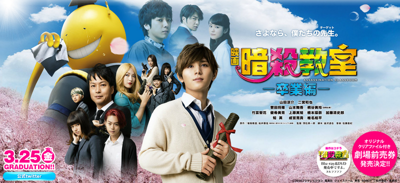 《暗杀教室:毕业篇》根据松井优征创作的人气少年漫画改编,由羽住英一郎执导,山田凉介主演,二宫和也、菅田将晖、桐谷美玲和成宫宽贵等出演。《暗杀教室~毕业篇~》延续《暗杀教室》内容,讲述的是三年级E班迎来毕业的日子,他们毕业前能否杀死杀老师,查到杀老师的真实身份都在片中揭晓。该片于2016年3月25日上映。